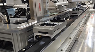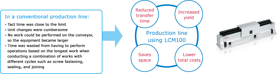 Transfer takt time can be reduced simply by switching to the LCM100 linear conveyor in place of the free-flow conveyor or roller conveyor frequently used for transfer between manufacturing steps.