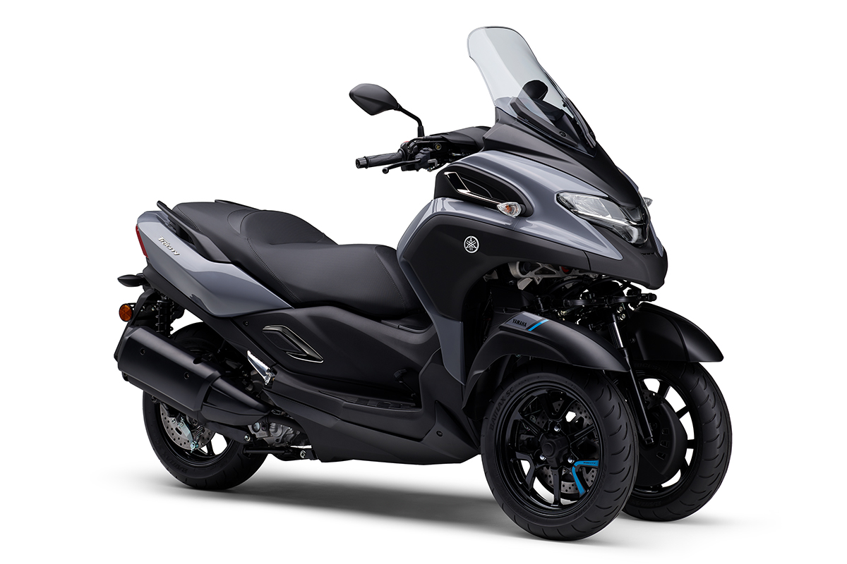 The TRICITY 300 is a 300cc LMW*1 commuter model using Yamaha Motor’s proprietary Leaning Multi-Wheel (LMW) technology*2 for its two front wheels, and was developed based on the product concept of “The Smartest Way to Commute.” The design concept was “Your Right Hand” (for supporting your work/business), and to work the LMW steering linkage into the design itself, the front uses an inverted triangular form to create a more three-dimensional look and feel. Further, creating space around where the LMW apparatus functions helps communicate a light and agile feel, while the concentration of mass around the rider and the slanted stance lines seen from the front and side views create the firmly planted look unique to LMWs.