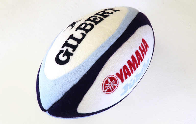 We made a Rugby Top League The Yamaha Motor Jubilo Official Mascot Ball with needle felting – the mascot ball is a little smaller than the real thing. We even reproduced the real YAMAHA, Jubilo and GILBERT logos.