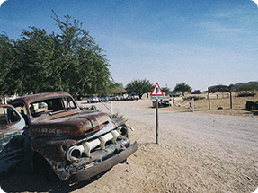 On the way to Windhoek, the capital of Namibia, Takeyan wanted to photograph some animals in the desert, so we drove hundreds of kilometers to Sossusvlei, also known as the Red Desert. The contrast of the red earth and the brilliant blue sky providing a backdrop for the rows of salt-air-blasted leafless trees set a scene resembling a surrealist painting by Dali.
