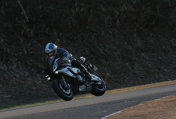 Next comes the changeover from the right turn to the left turn of the S-curve; it’s really light! As soon as I was about to shift my weight to the left side of the machine, it stood upright, and before I knew it, I was already beginning to bank left. It’s that quick. I quickly open up the throttle and position myself to head into the next turn. The engine gave a quick growl and the machine sank with the force of the traction at the rear, quickly settling down into what felt like a steady, reassuring attitude. I have to admit that I’m not at all afraid now, although I’m handling an extreme-performance machine.